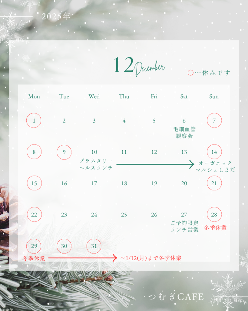 * 12月の予定をおしらせしましたが、12/21のれんげじオーガニックマーケットは出店しませんでした、すみません、訂正致します。 つむぎCAFEは出店しませんが、今回のれんげじオーガニックマーケットは、12周年記念の特別バージョンで開催です、どうぞお楽... -