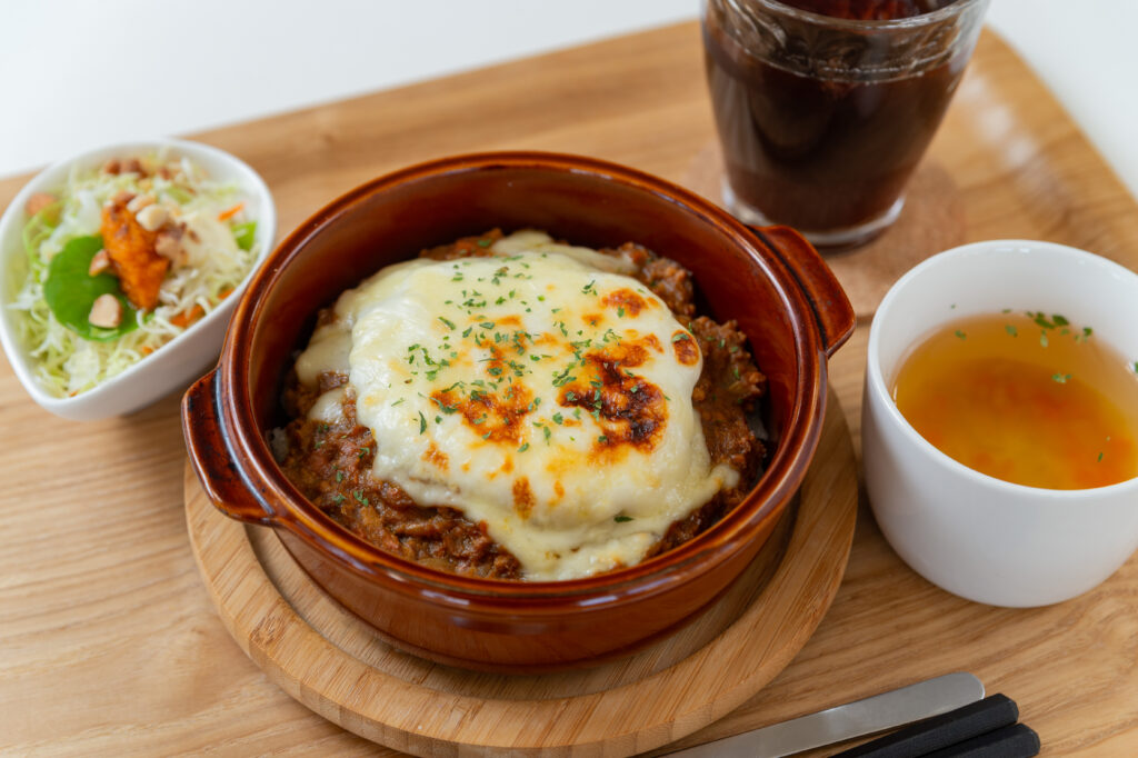 キーマカレーに自家製ホワイトソース&チーズをのせて焼き上げた、つむぎカフェならではの一皿。 - ガパオランチ(からい/からくない) 1,375円(税込)