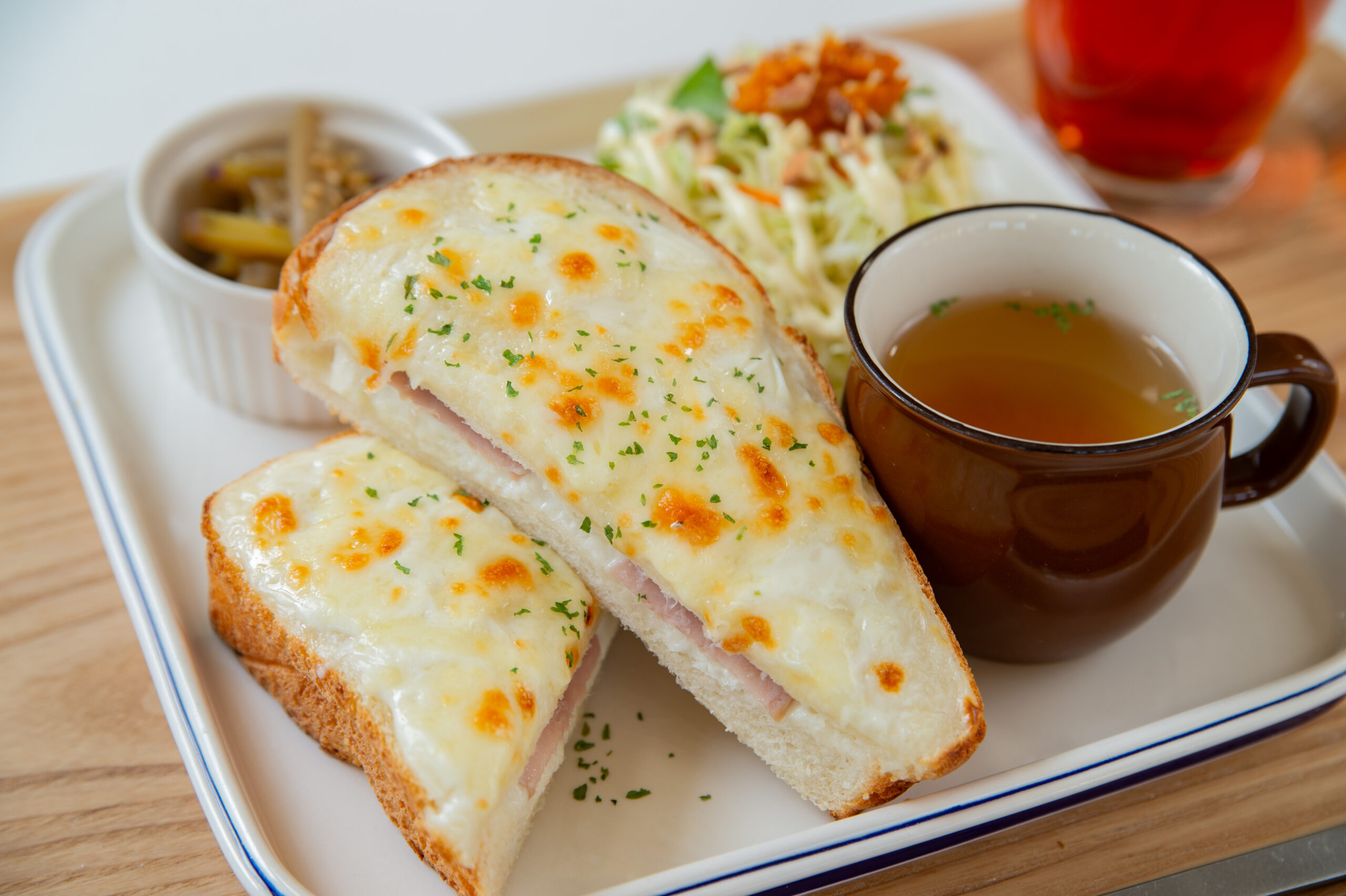 天然酵母でじっくり発酵させて焼き上げたパンに、無えんせきのハムや自家製ホワイトソースをはさみ、セルロース不使用のチーズものせてこんがり焼きました。