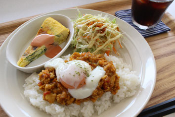 ナンプラーとバジルソースをふんだんに使った、つむぎCAFEオリジナル「ガパオライス」 味はHOT(辛)とNORMALが選べます -